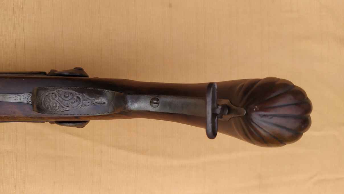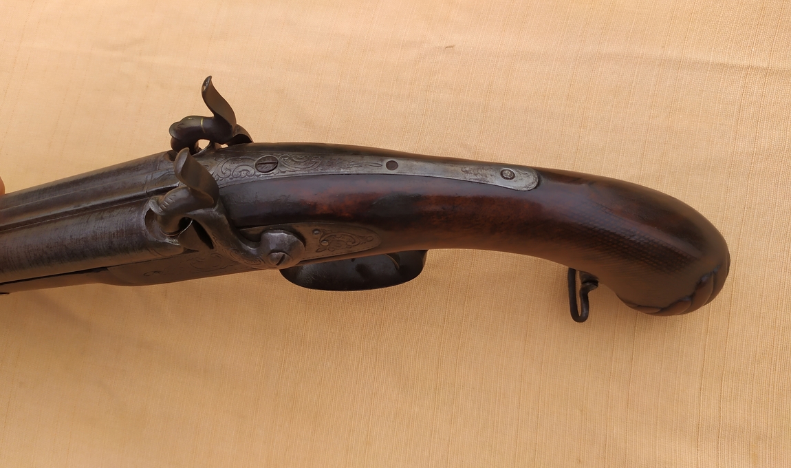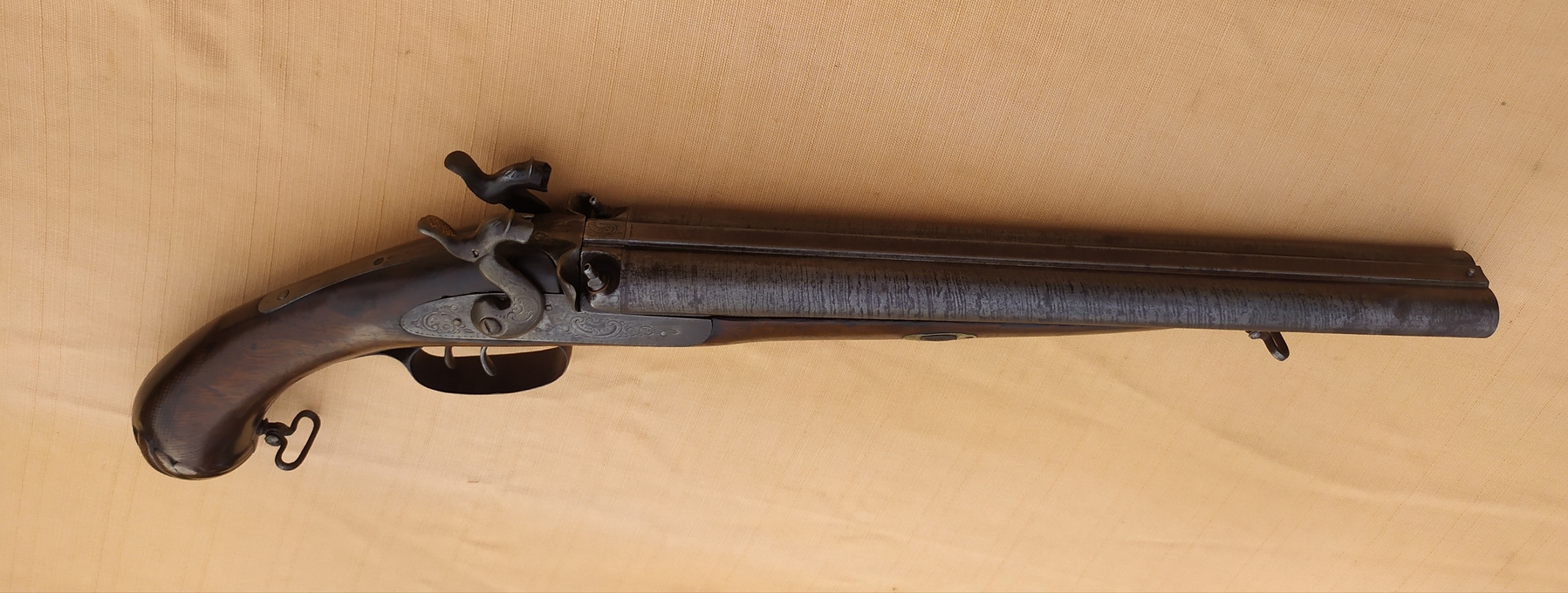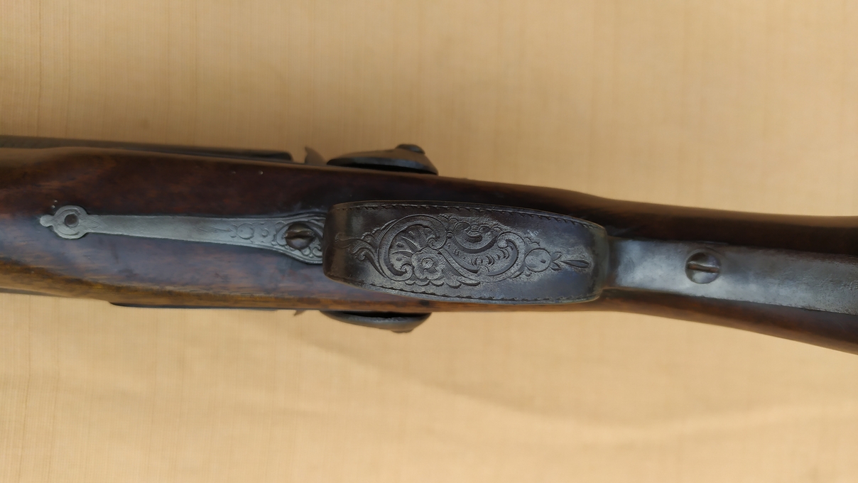 Délka 56cm, délka svazku damaškových silnostěnných hlavní 35cm, ráže 17,5mm, pistony na zápalky 4mm průchozí do hlavní. Vnitřek hlavní matný, bez koroze. Hlaveň drží na klínek a háky, uzamčení pevné, bez vůle.