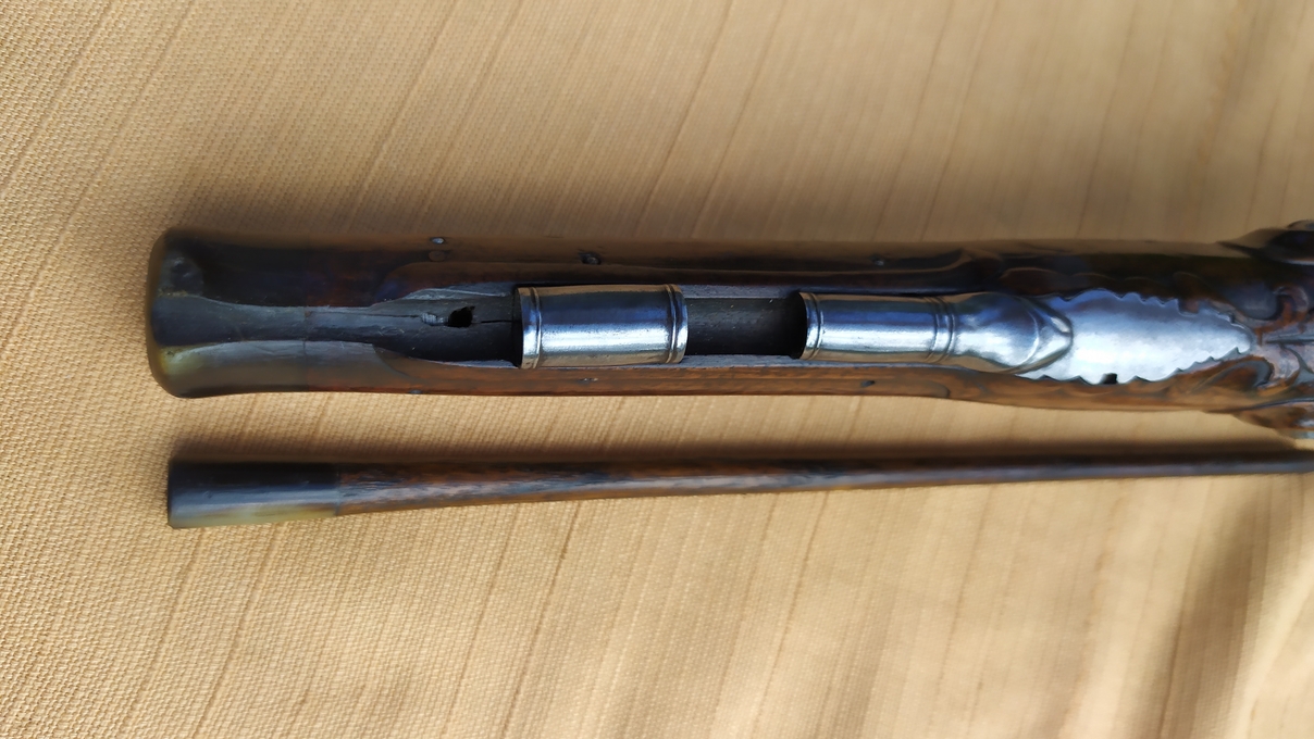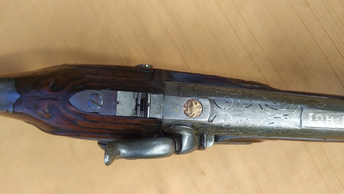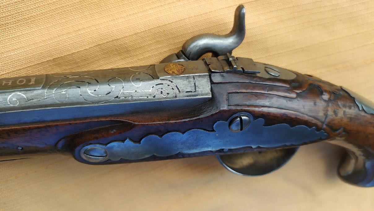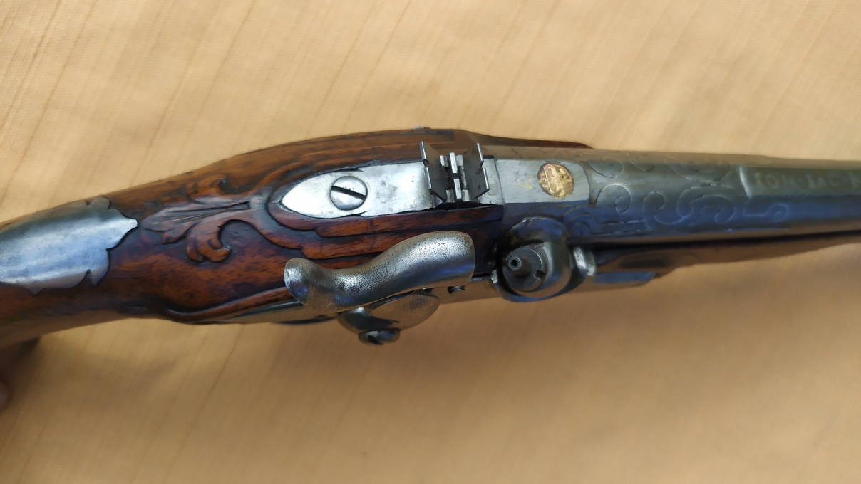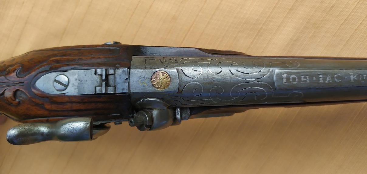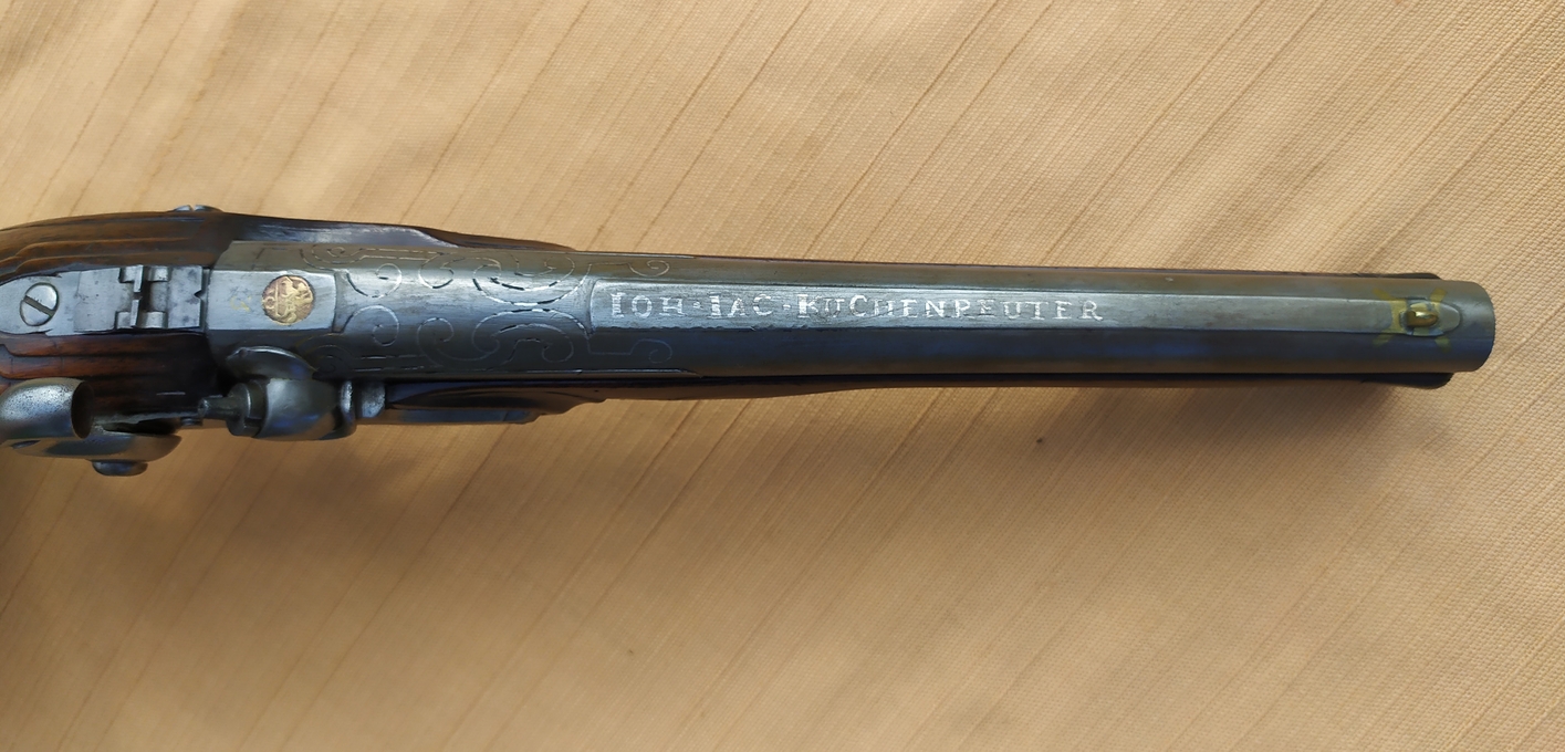 Na vrchní ploše hlavně signatura ve stříbře IOH. IAC. KUCHENREUTER, na části hlavně taušírování ve stříbře. U puškařské značky je č.3 ve zlatě ( pistole č.3 ? ).Dvouplátkové sklopné hledí, souprava ocelová. Konec pažby u ústí hlavně je z rohoviny. Piston na zápalky 4mm průchozí do hlavně.