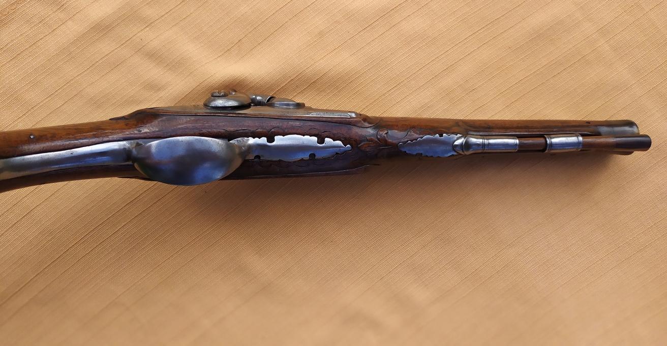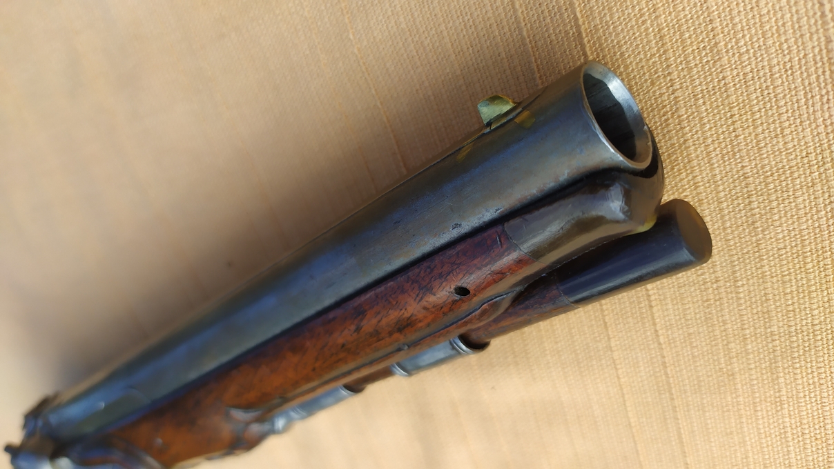 Délka 38cm, délka drážkované hlavně 22,5cm, zlacená muška. Ráže 13mm. Vnitřek hlavně čistý, drážky zřetelné, bez koroze.